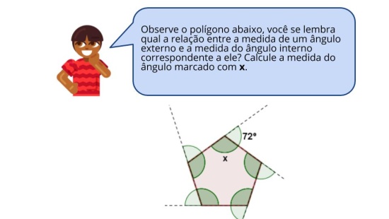 Identificar os ângulos externos de um polígono regular e a relação entre a medida de cada ângulo externo com a medida do ângulo interno correspondente.