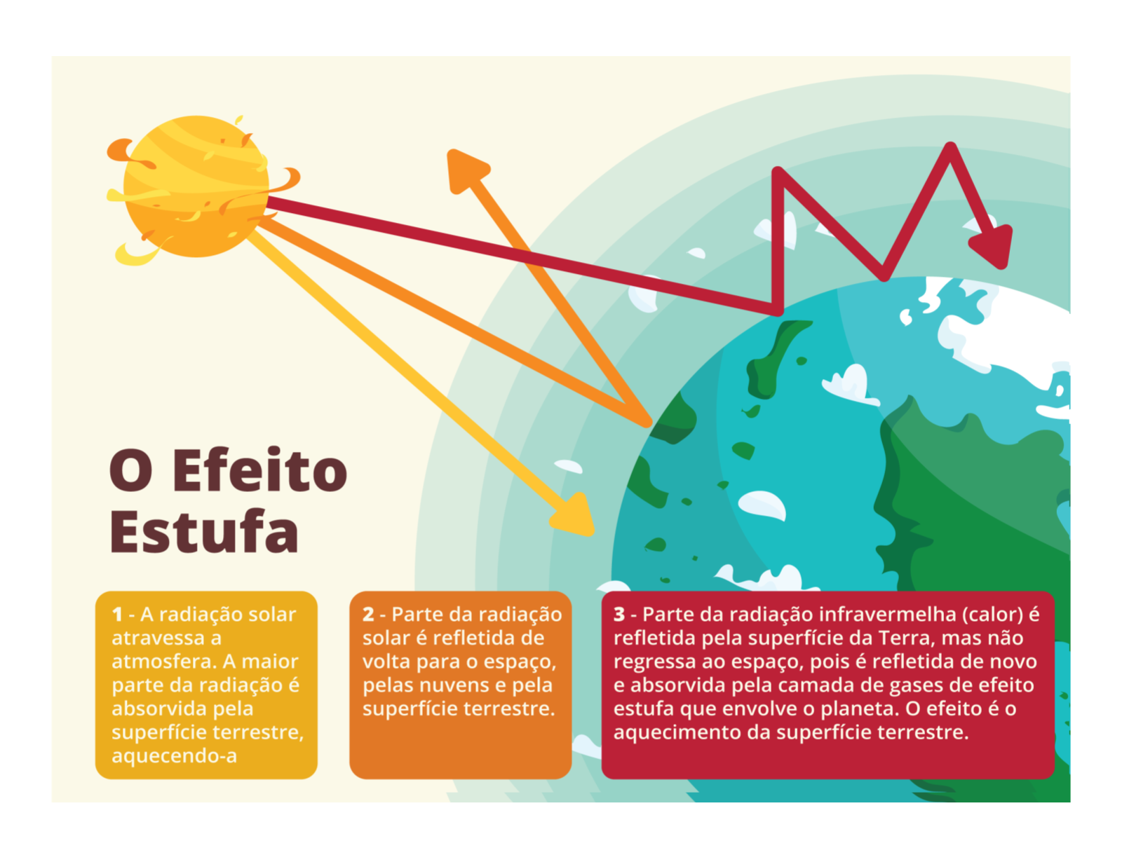 Descrever o mecanismo natural do efeito estufa, seu papel fundamental para o desenvolvimento da vida na Terra, discutir as ações humanas responsáveis pelo seu aumento artificial (queima dos combustíveis fósseis, desmatamento, queimadas etc.) e selecionar e implementar propostas para a reversão ou controle desse quadro.